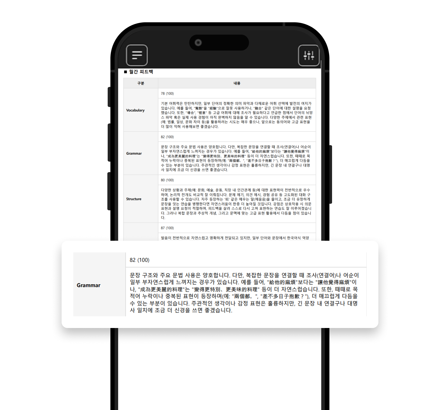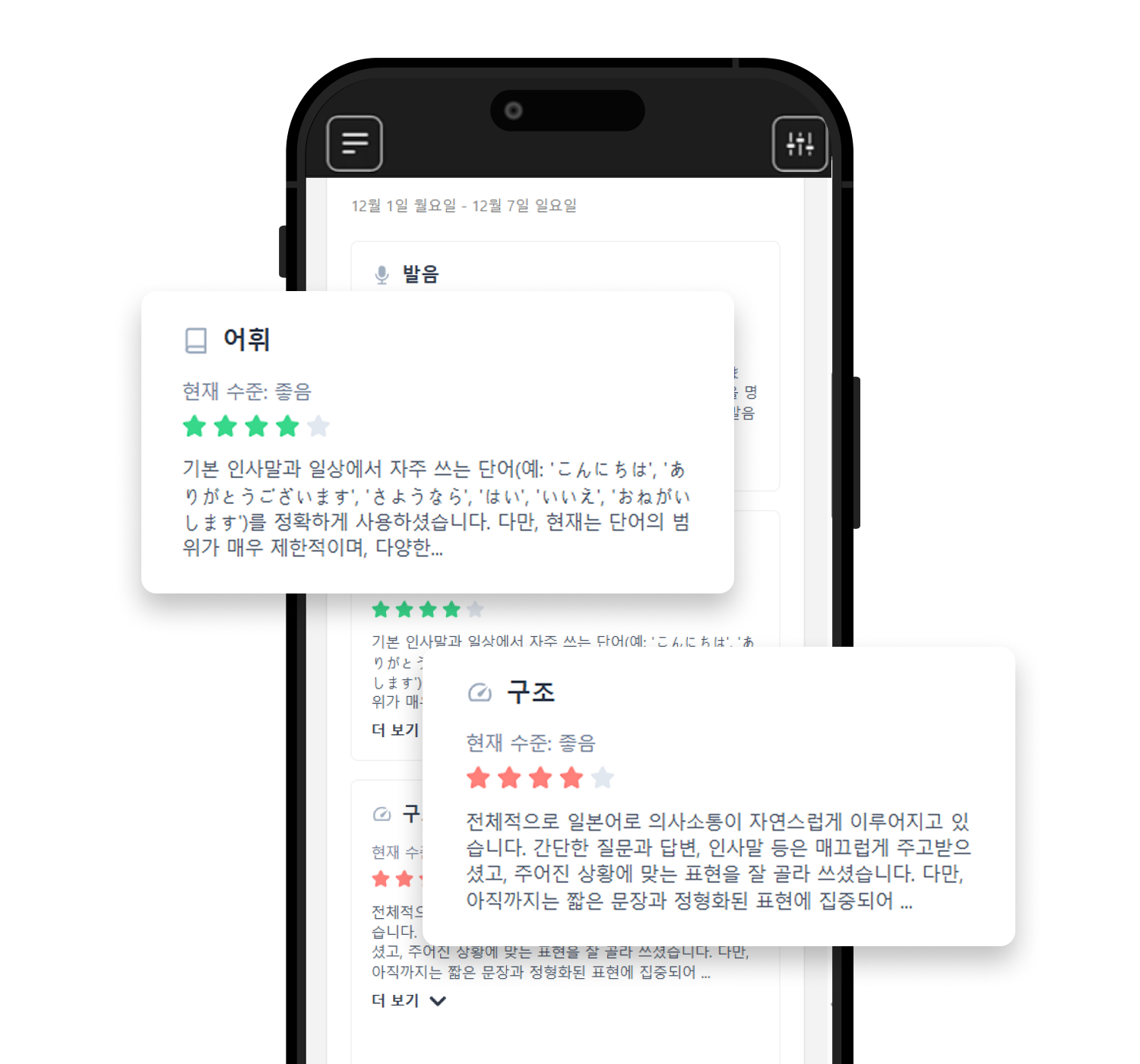 레벨 평가 결과가 구체적이어서 공부 방향을 명확히 잡을 수 있었어요.